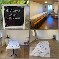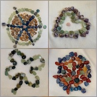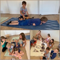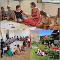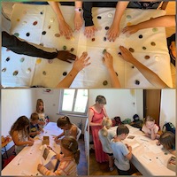 Nach einer Znünipause im Garten wurde die Klasse in zwei Gruppen eingeteilt. Abwechselnd durfte eine Gruppe im Seminarraum Massagesteine ausprobieren, Mandalas kreiieren und sich beim Steinspielen messen, während die anderen Kinder erleben konnten, auf welche Weise man einen Heilstein aussuchen kann.